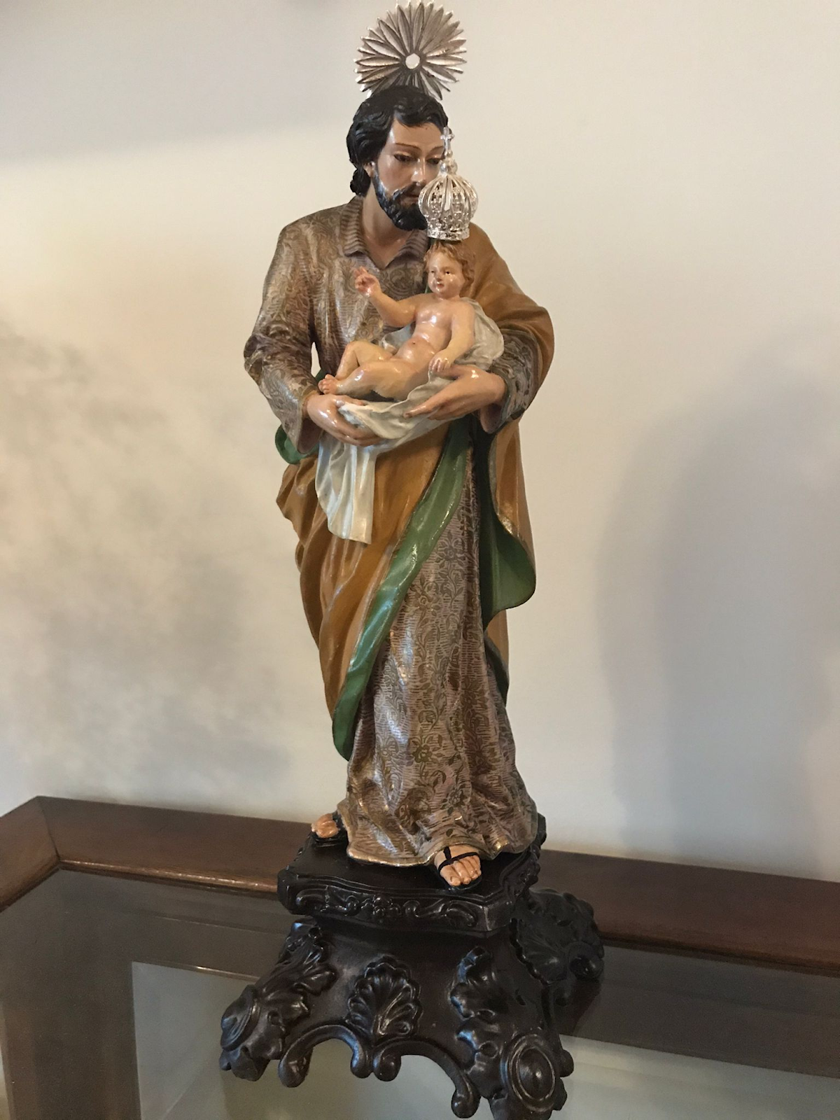 Pequeña imagen de San José con el Niño Jesús en brazos, de 30 centímetros de altura. Situado sobre una peana alcanza una altura total d 40 centímetros.